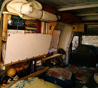 En dessous, le côté droit avec le bureau pliable (le panneau blanc) et le coté gauche avec la cuisine et les rangements pour la nourriture et les vêtements...